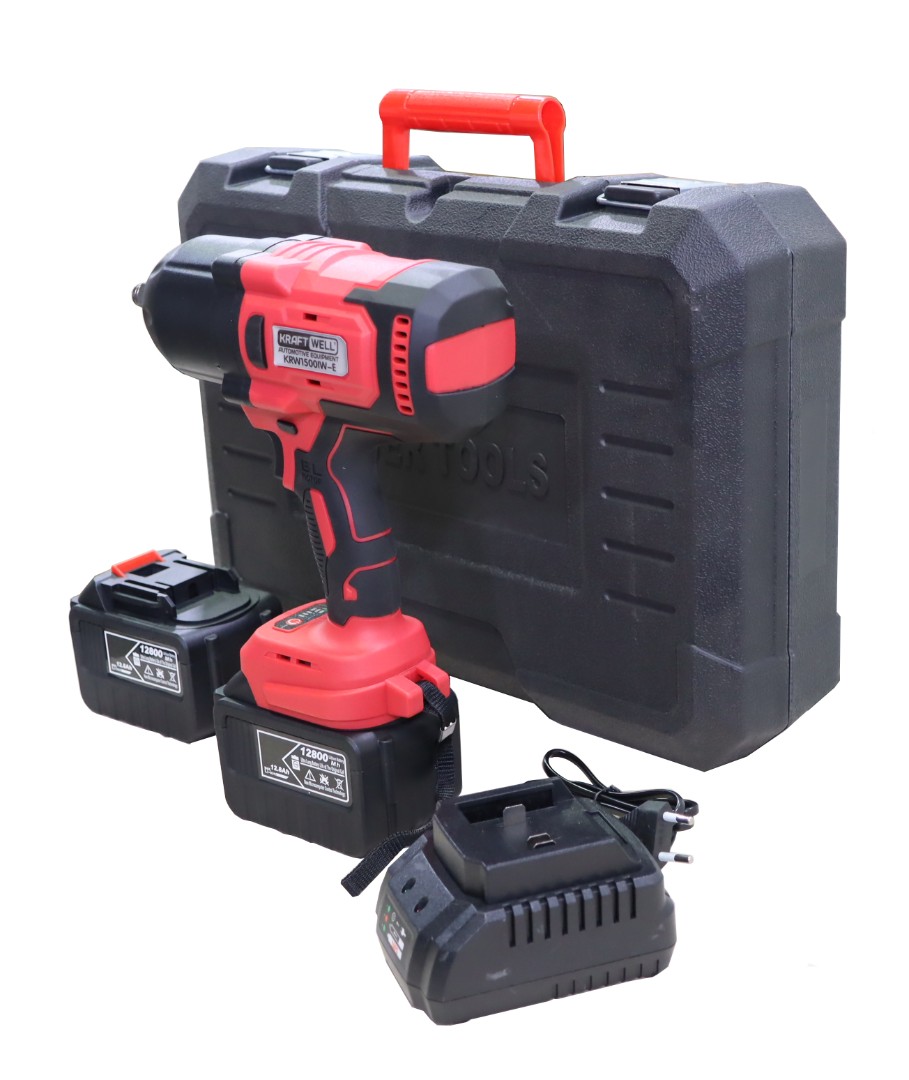 Аккумуляторный гайковерт KRAFTWELL, модель KRW1500IW-E с ударным механизмом развивает крутящий момент 1500 Нм. Размер посадочного квадрата составляет 1/2”, что позволяет работать с ударными головками от 10 до 27 мм. Поставляется в удобном пластиковом кейсе для переноски. В комплекте с гайковертом поставляются 2 аккумулятора емкостью 12,8 Ah каждый и зарядное устройство.